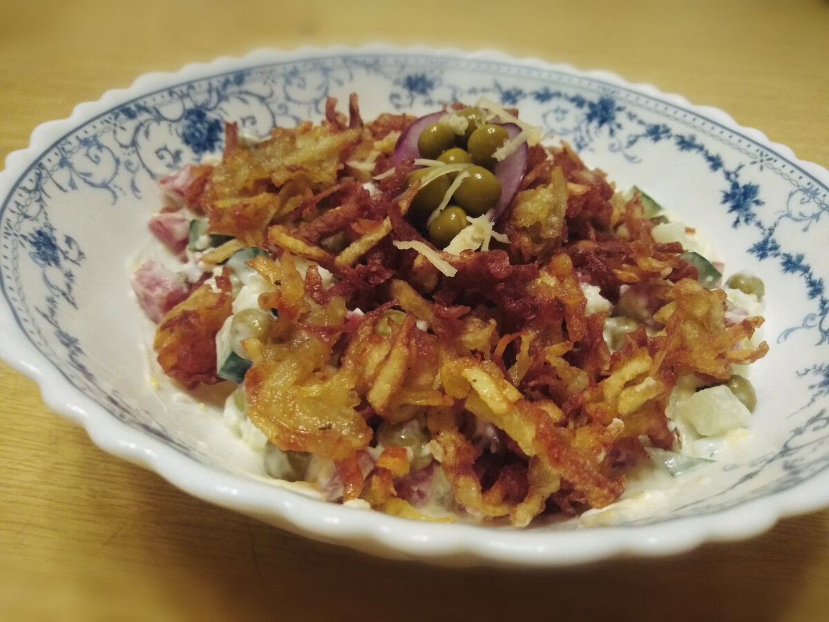- Картофель натрите на мелкой тёрке, обжарьте 2-3 минуты в большом количестве масла. Дайте маслу стечь и выложите сверху на салат.