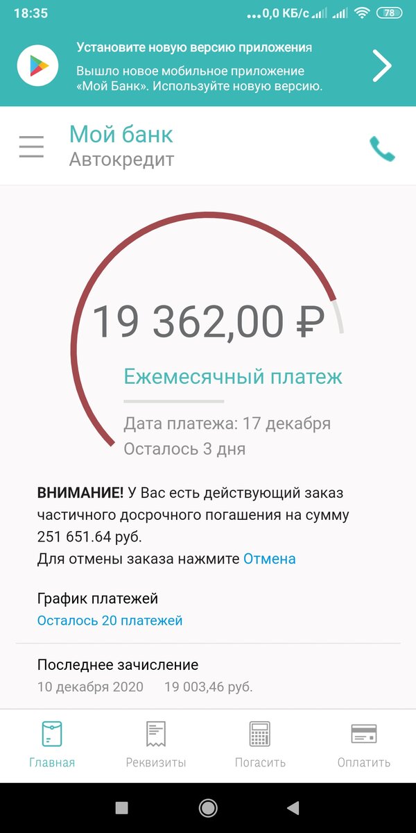 5.3. Сетелем автокредит 19000р(первый скрин в статье), это текущий платёж (как раз этот автокредит хочу закрыть досрочно), в прошлом месяце я уже внёс 250 т.р., изначально платёж был 37000р, после частично-досрочного погашения он будет не более 5000р. Полностью закрывать не хочу, т.к. на машине наложены аресты(её не могут забрать приставы пока она в залоге у банка).