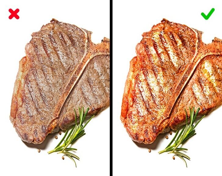 Никогда не жарьте мясо, которое только что достали из холодильника. Оставьте его при комнатной температуре на час-два - оно "прогреется" и при приготовлении будет прожариваться равномерно, благодаря чему вы приготовите идеальный стейк вне зависимости от того, какую именно прожарку предпочитаете. А чтобы получить красивую корочку, обязательно промокните мясо перед жаркой бумажным полотенцем.