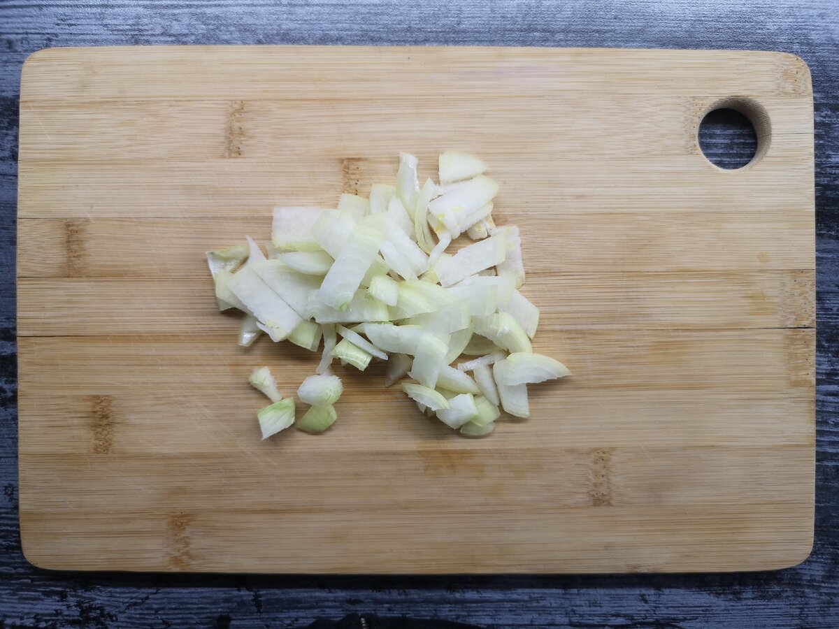 - Пока закипает, рубим лук и ставим сковородку греться.