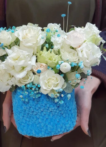 С наступлением зимы, наши флористы начинают использовать соответствующие времени года цветы, декор и кашпо. Мы не боимся экспериментировать и стараемся регулярно удивлять нашим покупателей. Сегодня мы собрали новую композицию. Это красивая и необычайно милая композиция. Ее стиль подчеркивает необычайно нежный набор цветов. Но она еще и зимняя. Ведь собрана в специальном кашпо ручной работы. Кашпо вязаное из пряжи микрополиэстер. Этот вид нити пышный и мягкий. Получилось симпатичное "теплое и уютное" кашпо. В новогодней, рождественской и зимней флористике могут использоваться и другие материалы, декор. Например, классические шляпные коробки. Только они идут с новогодними и рождественскими рисунками, а также с надписями 2021, "С Новым годом!" и другими. Набор цветов должен соответствовать типу выбранной коробки или кашпо. В представленной композиции мы собрали воедино одни из самых нежных цветов. Конечно задействовали розы, кустовые розы, лизиантус, веточки кустовой хризантемы, гипсофилу