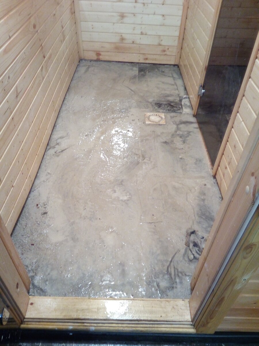 Я положил кафель в душевой и парилке, это была ошибка. Зимой баня не отапливалось и ей пользовались только по выходным. Из перепадов температуры плитка стала трескаться и отваливается. Решили демонтировать плитку и раствор, которым выравнивали пол до гидроизоляции. Поле этого пол залили раствором бетона, так по сей и осталось. Не так красиво, как с плиткой, зато без проблем.