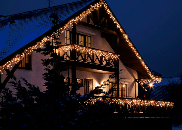 лье. Если у вас частный дом, то разгуляться вообще есть где. Обязательны гирлянды, которые можно расположить на фасаде дома, калитке или даже деревьях. Только выбирайте специальные модели для улицы, они не подвержены холодам, влагостойкие и не выйдут из строя, если пойдет снег.