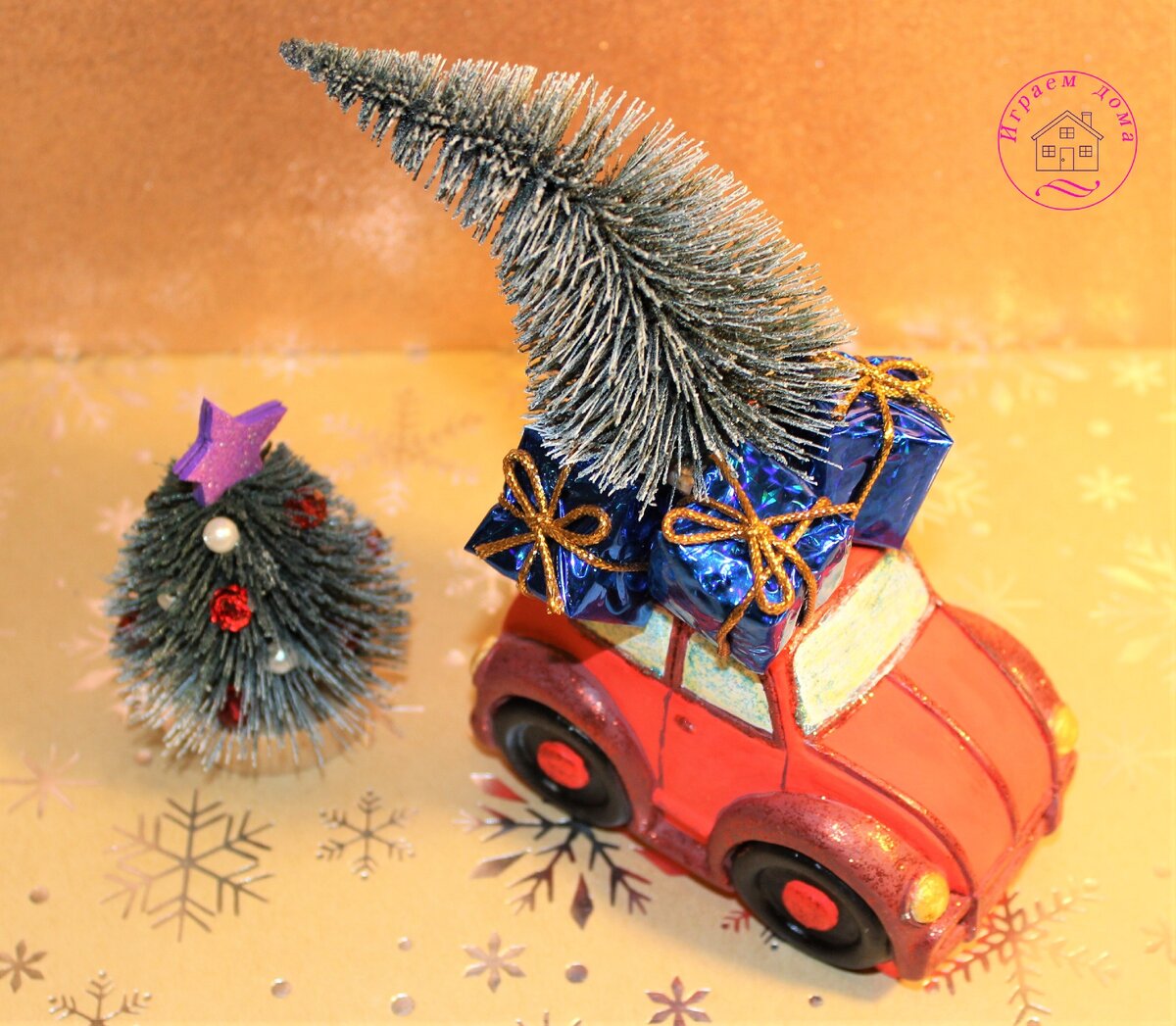 К ней ещё прикупили маленькую ёлочку и вернувшись домой приступили к изготовлению так модной сейчас - "Красной Новогодней Машинке".