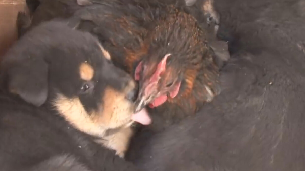 Курица с детства начала воспитывать щенят и ухаживать за ними дарить