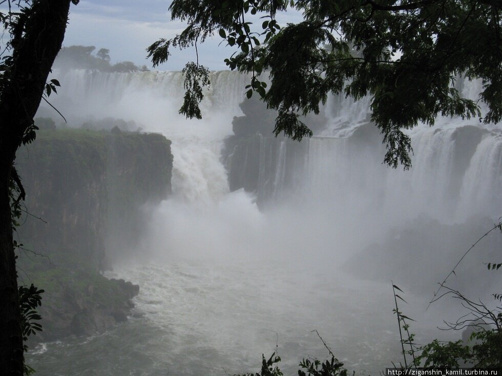 До Игуасу, находящемуся на границе с Бразилией, долетели за полтора часа. Сразу после обеда отправились по холмистой, покрытой тропическим лесом равнине туда, откуда доносился громоподобный гул.Когда обошли шныряющих по красноватой земле двух сантиметровых муравьёв-отшельников и отбились от наглых попрошаек коати, а также от вечно голодных крокодилов,мы, наконец, вышли из пышных зарослей и застыли от восхищения: открывшаяся панорама потрясла! Представьте: в два каньона, образовавшихся в результате тектонического разлома, низвергаются с отвесного уступа 275 (!!!) раздельных водопадов!!!Более величественного зрелища трудно представить. Над каждым сливом клубятся молочные облака, ниспадают искристые шлейфы, рассечённые сочной радугой.Глядя на всё это, понимаешь, что водопад Игуасу включили в число семи чудес природы не случайно. Вид воды, падающей с высоты 70 метров, не только завораживал, но и, как ни странно, действовал успокаивающе.Одновременно мы почувствовали прилив сил и бодрости. Наши предки верно подметили: вода – живая! А тут ещё и сам воздух густо пропитан влагой. Что интересно, если вы зададите кому-либо вопрос о том, какой водопад на нашей планете самый большой, будьте уверены, большинство ответит: «Ниагарский в США!» (правда, он по преимуществу канадский – ей принадлежит 86% слива)*. Кто-то вспомнит африканский водопад Виктория (местные его называют куда образней – Гремящий дым), открытый путешественником Ливингстоном в 1855 году. И только единицы уточнят: а что имеется в виду – ширина, высота, или мощь, поскольку термин «самый большой» по отношению к водопадам звучит весьма неопределённо. Если имеется в виду высота, то это венесуэльский Анхель (1054 метра). Если ширина слива – водопад Кон в Лаосе (12500 метров.) Но, самый мощный, самый зрелищный и изумительно красивый — это, бесспорно, Игуасу. За сутки он низвергает в среднем один миллиард тонн воды! Недаром Игуасу переводиться с индейского языка гуарани как «Большая вода».Сила удара огромных масс о камни такова, что вода выбивается обратно столбами водяной пыли.А скорость течения ниже слива столь велика, что образуются стоячие волны.Охватить одним взглядом весь многокилометровый фронт Игуасу, состоящий из 275 отдельных водопадов, разделённых высокими утёсами, базальтовыми скалами физически невозможно.Поэтому даю только отдельные фрагменты.Под один из сливов мы попытались заплыть, но за одну секунду промокли насквозь. Не помогли даже полиэтиленовые накидки, а лодку до середины борта залило водой.Нам, чтобы обойти и отснять все ревущие, клокочущие каскады понадобилось два дня!