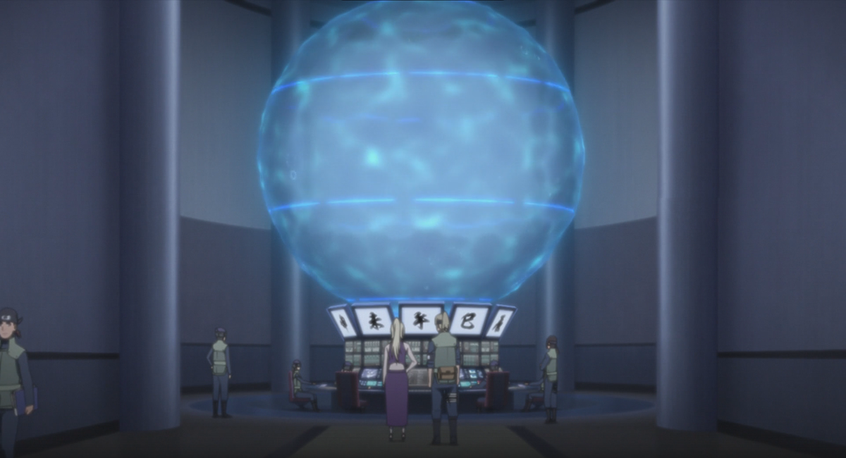 Помните, как во время 4 мировой войны шиноби, в Штабе Альянса сенсоры наблюдали за полем боя с помощью проекции чакры в виде огромного пузыря. Сейчас в отделе наблюдения Конохи существует подобная проекция, но уже на основе технологий, а не ниндзюцу.