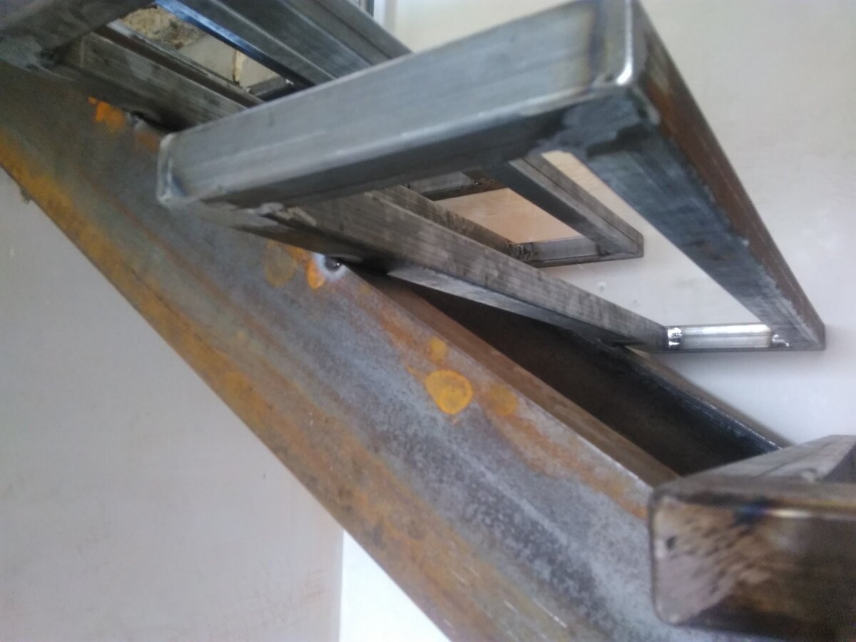 Начну с того что ступени начиная сверху, просто прихватываются к косоуру временно. А уже затем когда все ступени прихвачены, ещё раз смотрим всё что можно изменить, пока не поздно и уже потом начинаем проваривать и укреплять ступеньки капитально.