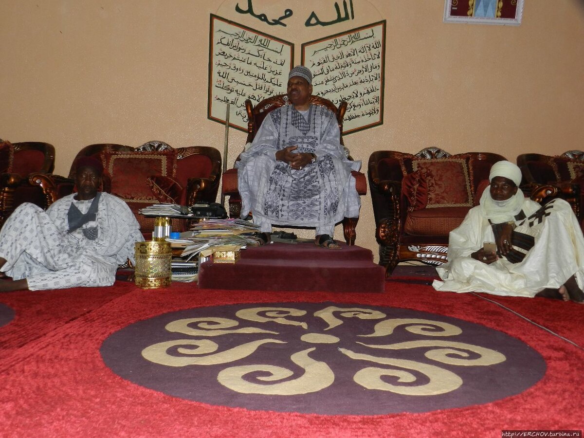 Канури и хауса земледельцы, по вероисповеданию мусульмане. Единственное отличие, канури — мусульмане с XI века. Хауса окончательно приняли ислам в начале 19-ого века. В Нигере это один из главных составляющих страну народов. По оценке 2016 года, численность хауса в Африке свыше 60 миллионов человек. По переписи 1997 года канури в Нигере 400 тыс. человек, тогда как в Нигерии — 3 млн (1985). Отметим, что образовавшееся экстремистское движение Боко Харам было создано этническими канури. Как отличить первых от вторых, я так и не понял. Водители и гид объясняли, но я этот момент упустил. Каюсь, мимо меня прошло многое. Я так и не разобрался, как по орнаменту фасада определить, кто живёт в доме: хауса,кануриили фульбе. Что касается последних, то мне очень повезло увидеть и сфотографировать их Босса! Случилось это следующим образом. Мои спутники ушли вперёд. Я же, постоянно всё и везде изучал и потому отстал. Иду неспешно, гляжу, Тойота Ленд Крузер стоит. Рядом мелкий пацан машину явно охраняет. Я взглянул на номер, он состоял из одних букв. Мне подумалось, султан приехал. Ан нет, это оказался первый парень народа фульбе. Я рот разинул, словно никогда и нигде джипов не видел, смотрю, мозгами переваривая.... Тут из ближнего дома выходит человек 15-20. Впереди охрана, за ними двое солидных дядек в белоснежных одеждах. Я поднял вверх руки в качестве приветствия. Они ответили. Тогда я показал на фотоаппарат, попросив сфотографировать. Боссы остановились — я нажал на кнопку. Как позже выяснилось, большой человек народа фульбе приезжал в Зиндер на переговоры с султаном. Позже зашёл к кому-то в гости, и тут как раз на пути я подвернулся. Бывает... Впрочем, события того дня развивались стремительно, меня позвали мои товарищи. Оказалось, султан действительно приехал. Его Высочество во дворце, он нас примет и уже ждёт. А вот чтобы туда пойти, вся наша группа ждёт уже меня. Что тут сказать? Друзей и подруг вольно или невольно я напрягал в этой жизни неоднократно, а вот чтобы из за меня ждал султан, такого со мной никогда ещё не было...
