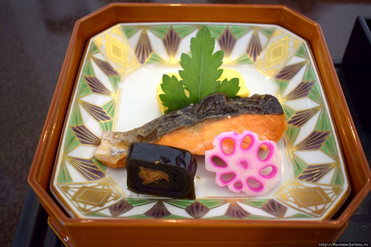 Во всей японской культуре, будь то японские храмы, традиционная одежда, живопись, архитектура, сады, парки или кухня, одной из основных черт является эстетика. Японцы считают, что едят дважды — первый раз глазами, а второй раз ртом. Поэтому вы никогда не встретите некрасиво поданное, неоформленное или бесформенное блюдо. Вы обратили внимание, что и пельмени на фото выше были не просто положены в кучу в тарелке, а красиво нанизаны на палочку и обжарены? Поэтому и кусочек лосося на завтрак подается в красивой мисочке с добавлением маленького завитка из морских воорослей и вырезанного маринованного корня лотоса.
