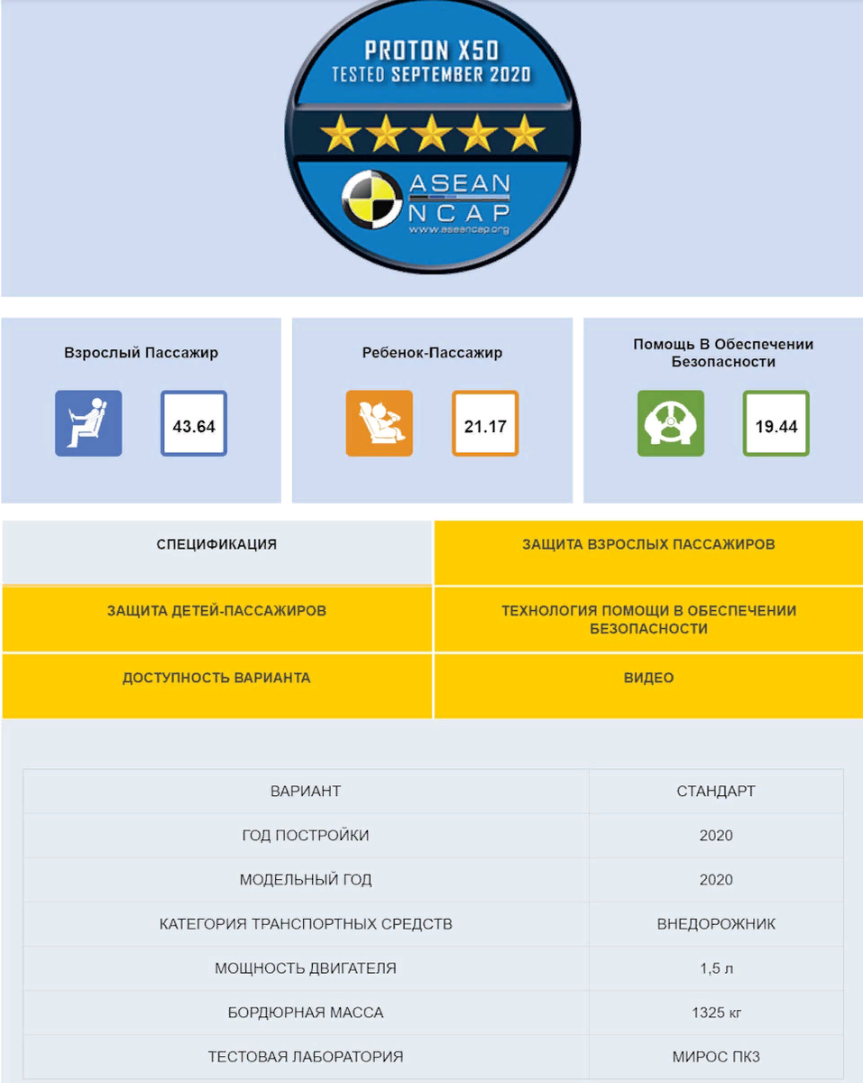 Proton X50(он же #Кулрей успешно набрал общий балл 84,26 балла, что дает ему право на 5-звездочный рейтинг ASEAN NCAP.