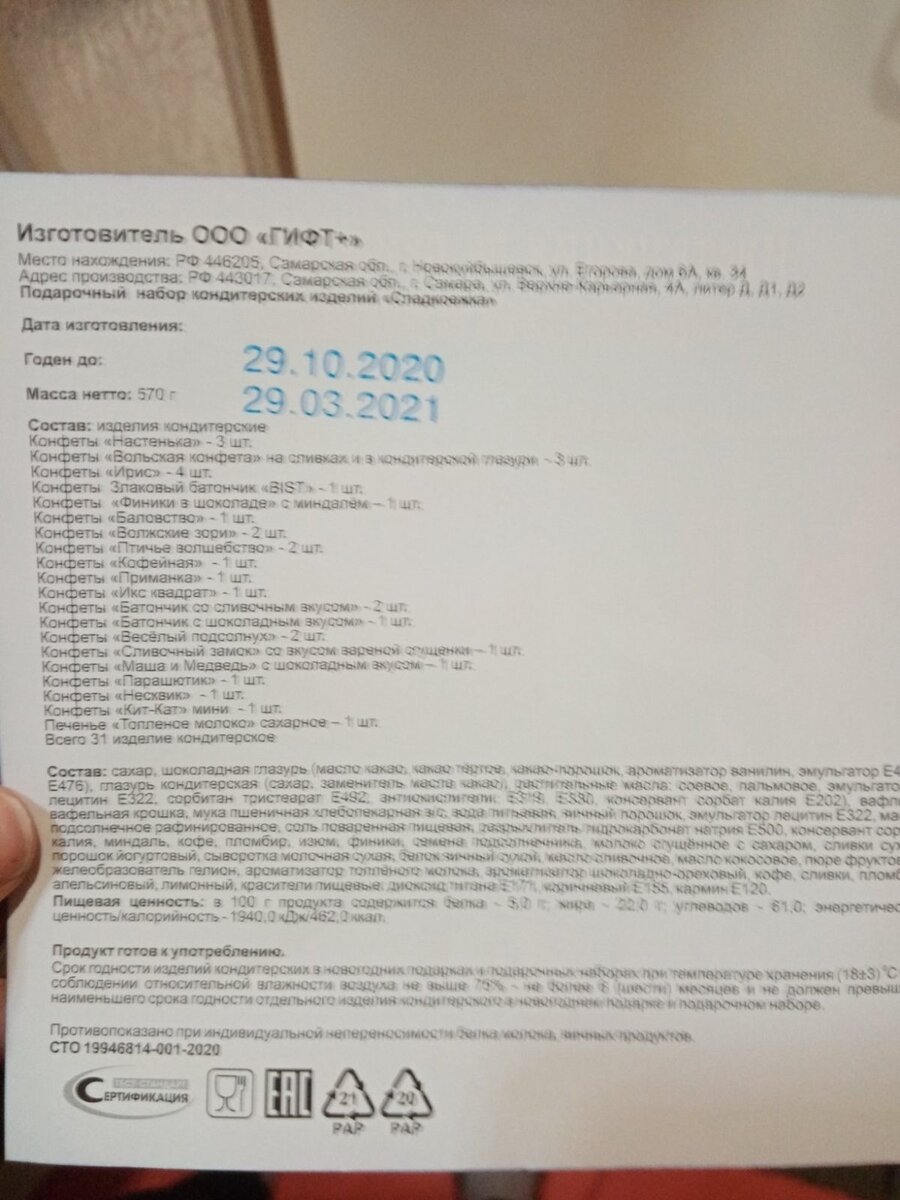 «Получили конфеты подарок в школе! Такое простит меня Г.. Такое чувство что эти конфеты лежали года 2, где-то, воняют, горькие, жёсткие! Не на одной конфеты нет даты производства, конфеты как будто с брака откуда то списаны! Это просто ужас а не подарок
