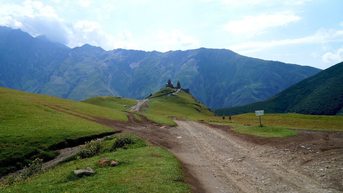 В Степанцминду заехали в сумерках. Предприимчивый Василий (хозяин гестхауса) на ниве сразу подкатил к нам и предложил ночевку. 1000 рублей с человека с завтраком (и, как потом выяснилось, чачей на ночь) показались нам вполне приемлимы. Утром на своих пузотерках рискнули заехать к монастырю святой троицы и нам это даже удалось, но с большим трудом и потерей пружины подножки на вулкане.
