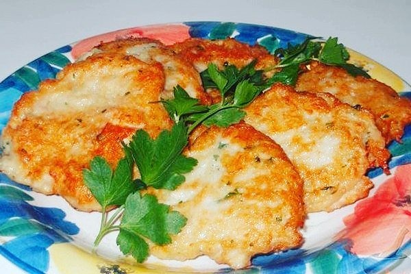 Продукты (на 8 порций) -Картофель - 5 шт.(500 г) -Куриное филе - 3 шт. (500-600 г) -Белок яичный - 2 шт. -Мука - 3 ст. ложки -Чеснок - 2 зубка -Зелень петрушки - 2-3 веточки -Соль - 0,75 ч. ложки -Масло растительное для жарки - 40-50 мл