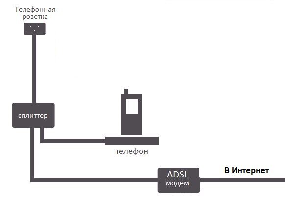 При просмотре веб-сайтов или получении видеофайлов высокая скорость загрузки данных из интернет важна для большинства пользователей. Затраты времени на передачу данных в обратную сторону, в интернет, имеют меньшее значение. Из семейства DSL для таких случаев больше всего пользы от технологии ADSL. Это сокращённое название от Asymmetric Digital Subscriber Line. Или асимметричная цифровая абонентская линия. В ней использует подход, где доступная скорость передачи (или полоса пропускания) цифровых модемов делится на неравные части, т.е. асимметрично, между данными исходящими от пользователя и данными входящими к пользователю. Ведь большинство пользователей загружают объём данных в несколько раз больше, чем отправляют. При этом по этой же двухпроводной линии можно одновременно и передавать данные, и вести разговор по стационарному телефону. А проложенный к квартире пользователя кабель может быть простым двужильным распределительным проводом, который применяется для аналоговой коммутируемой телефонной коммуникации.