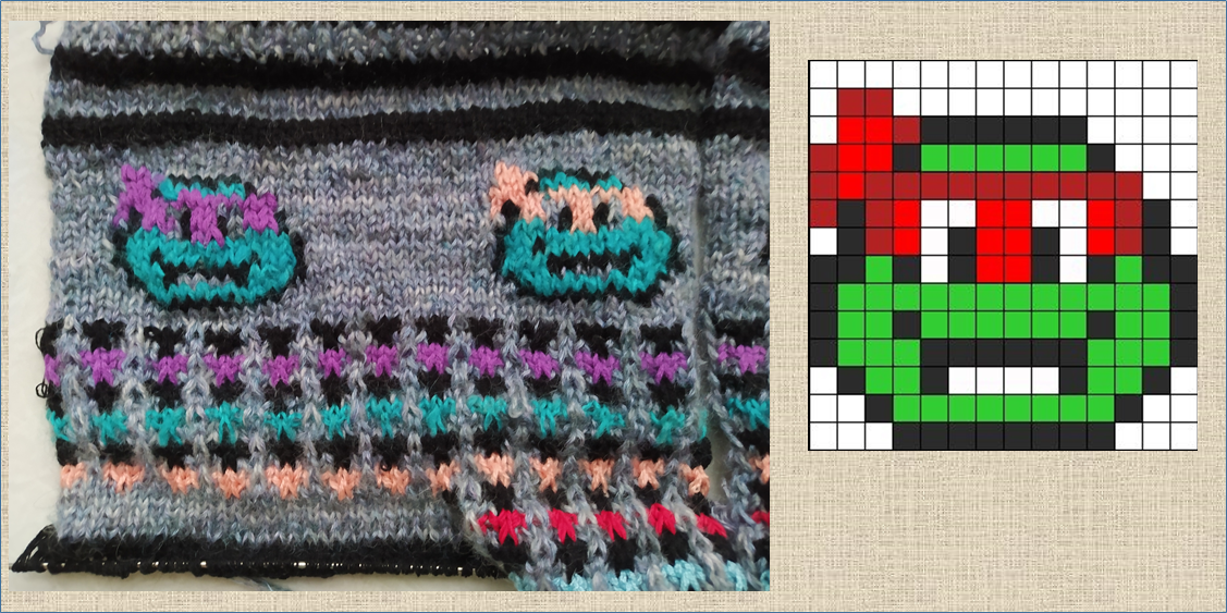Мой любимый зять в детстве фанател от черепашек ниндзя. И сейчас у него есть полочка с дорогущими фигурками этих героев. И много еще чего тоже есть. Даже постельное белье. Дарила я ему и ручки с наконечниками в виде голов этих черепашек. А вот теперь вяжу носки.