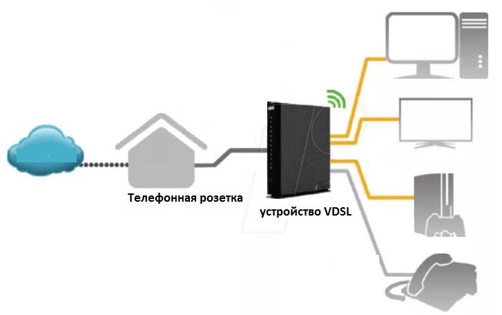 Ещё одним представителем семейства DSL, получившим широкое распространение, стала технология VDSL. Это сокращённое название от Very high speed Digital Subscriber Line. Или цифровая пользовательская линия со сверхвысокой скорость передачи. По сравнению с ADSL в данную технологию внесены улучшения. Шире всего VDSL находит свое применение там, где к абонентскому пункту, например, квартире пользователя, проложен качественный кабель из витой пары. Общая длина линии от АТС до пользователя при этом не слишком большая. За счёт качества канала связи и небольшого расстояния удаётся многократно повысить скорость передачи. Так, там где длина кабеля от абонента до оборудования провайдера услуг составляет не более 300 метров, скорость соединения с помощью VDSL можно увеличить до 56 Мбит/с. При длине не более 900 м до 25 Мбит/с. А при длине до 1500 м скорость соединения будет 10 Мбит/с. При этом по этой же двухпроводной линии по-прежнему можно одновременно и передавать данные, и разговаривать по телефону. Применение улучшенной версии технологии под именем VDSL2 позволило поднять скорость обмена данными до двух сотен мегабит в секунду. Кроме того, в ней присутствует поддержка телевидения высокой четкости и возможна настройка пропускной способности, чего не у ADSL.