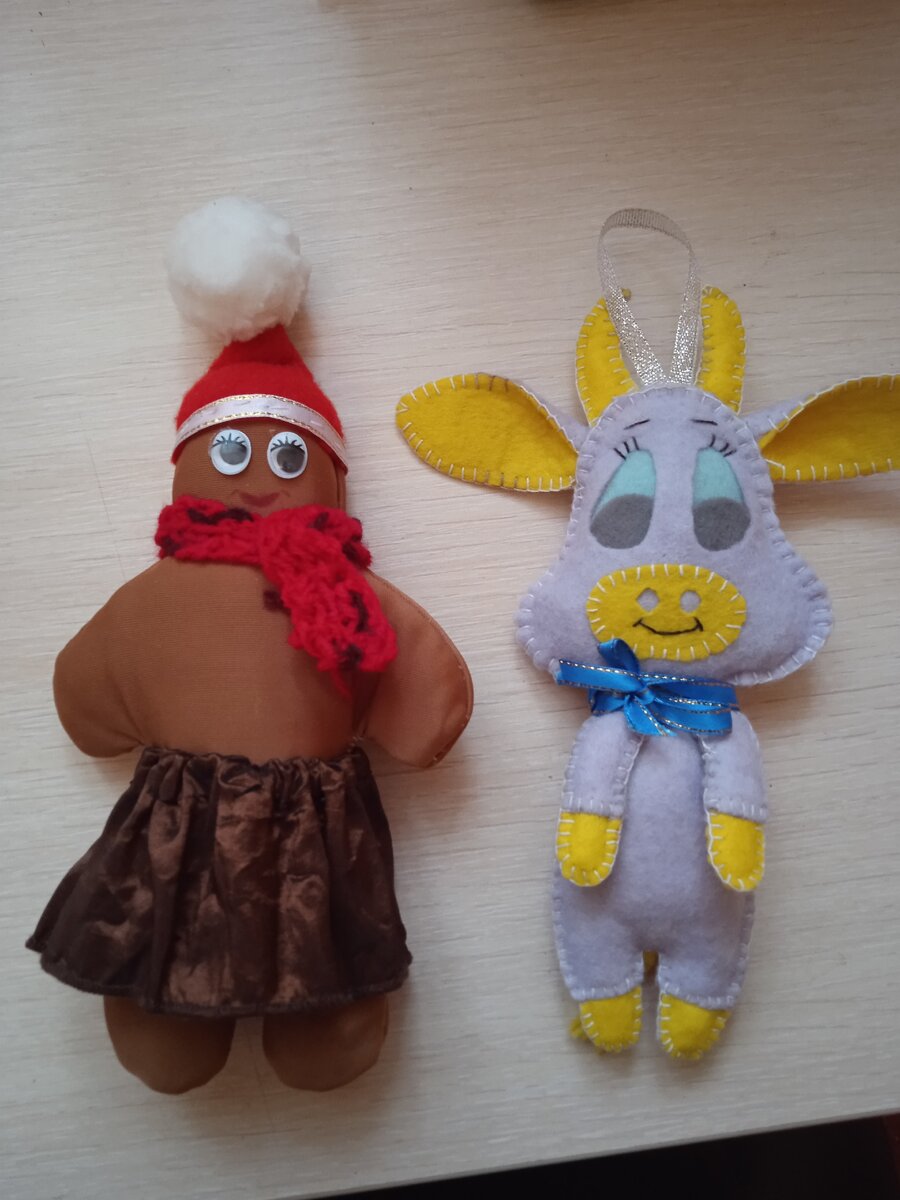 Приближаются новогодние праздники. В школе попросили сделать игрушки для школьного конкурса. В интернете нашли выкройки бычка из фетра и пряничного человечка. Нашли ткань, подходящую для шитья, и остатки фетра. Приготовили все необходимое для шитья: иголки, нитки, ножницы. Также нам понадобится наполнитель или вата.