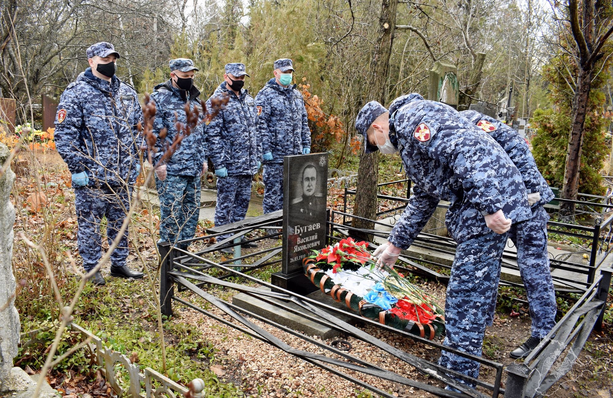 В рамках мероприятий, посвященных Дню Героев Отечества, сотрудники Росгвардии посетили место захоронения Василия Яковлевича Бугаева – участника Великой Отечественной войны, боевого летчика, ставшего в послевоенные годы первым начальником регионального управления вневедомственной охраны.