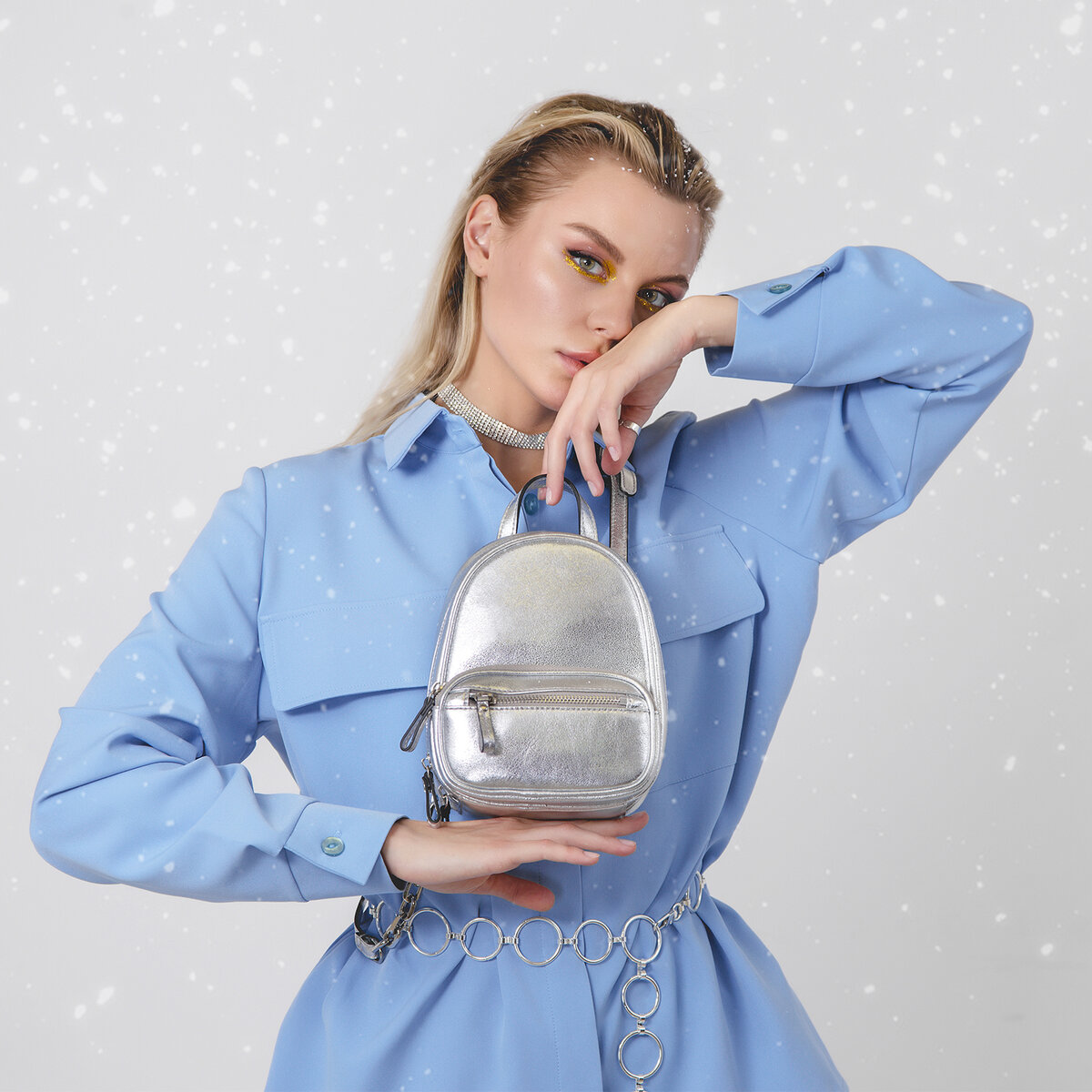 Светлое золото тоже впишется "в тему". На фото: сумка-рюкзачок FABRETTI. Стилисты провели предпраздничную фотосессию, чтобы наглядно
