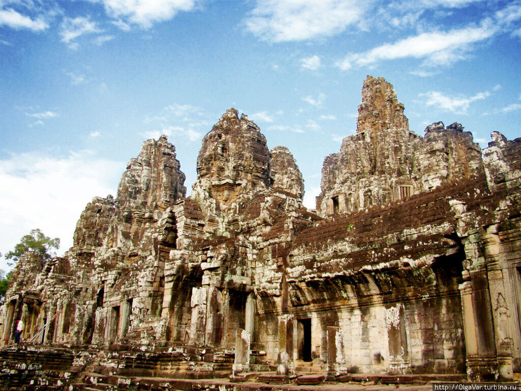 Поначалу ничего необычного не замечаешь, лишь камни, сложенные пирамидальными башенками, устремленными в небо. Но постепенно в этих грудах начинаешь различать… лица. Они взирают откуда-то сверху и приковывают к себе удивленный взгляд, сменяющийся восхищением. Их становится всё больше и больше, в какую бы сторону не смотреть. Именно этими лицами и знаменит храм Байон, который, как сегодня считается, построен во времена правления кхмерского короля Джаявармана VII на стыке 12-13 веков.