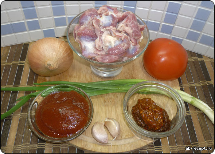 2. В сковороду наливаем подсолнечное масло и стакан воды, добавляем желудки, томатный соус, аджику и соль. Для того, чтобы мясо стало нежным и сочным, будем его тушить на среднем огне 40 минут, добавляя немного воды при испарении.