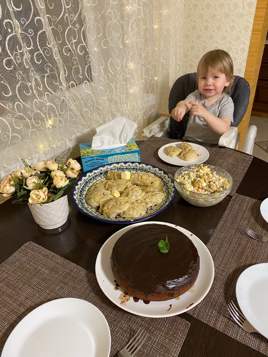 На #воскресныйужин манты, оливье с языком, мокрый шоколадный кекс.