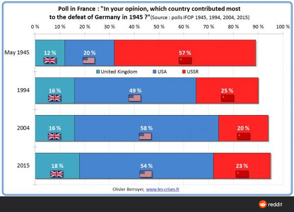 Мы с вами часто беседуем о взгляде иностранцев на итоги Второй Мировой Войны. И вот сегодня посмотрим, как менялось мнение французов о вкладе в победу над фашизмом.