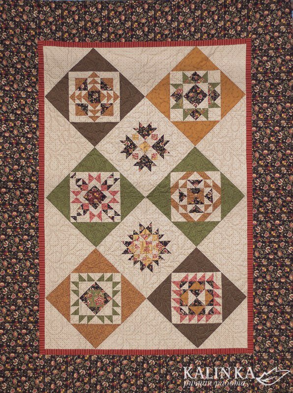 Кстати, фоновой ткани хватило тютелька-в-тютельку! Блоки расположены по диагонали и пришлось долго выверять, чтобы выкроить целые треугольники и квадраты их обрамления.
