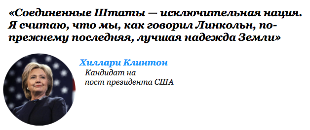 Андрей Шитов, обозреватель ТАСС, который долгое время работал в США, рассказал такую историю. Однажды он общался с Мадлен Олбрайт, а в своё время она постоянно и громко звучала на мировой сцене со стороны США, она же - первая женщина в должности государственного секретаря США (1997—2001). И он спросил Мадлен, почему американцы часто с мировых трибун называют себя исключительными (то есть, лучшими)? Американский дипломат четко возразила: "Это не мы, это нас так называют..." Эээээээээ... Вот так вот!