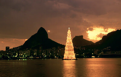 Самая большая в мире плавающая ёлка устанавливается в бразильском Рио-де-Жанейро, на озере Лагоа. Это озеро находится рядом с горой Корковаду, на которой находится статуя Христа-Спасителя. Но на время рождественских и новогодних праздников, именно ёлка становится главной достопримечательностью Рио. В этом году, она устанавливается уже в 16-й раз. Дерево имеет высоту - 85 метров, а общий вес конструкции - 542 тонны. Всё это удерживает на плаву четыре понтона, общей площадью 810 метров квадратных. Елка украшена гирляндами, общая протяженность которых составляет 105 километров, а количество фонарей в этих гирляндах насчитывает около 3 млн 300 тысяч штук. Благодаря этому, новогоднее дерево может принмать самый разнообразный окрас, и даже воспроизводить анимированные картины.
