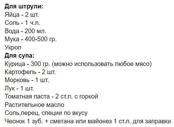 Берем удобную миску и смешиваем в ней 2 яйца, 1 ч.л. соли, 200 мл. воды, размешиваем, затем добавляем 400-500 гр. муки и замешиваем тугое тесто. Ставим отдыхать, а пока начинаем готовить суп.
