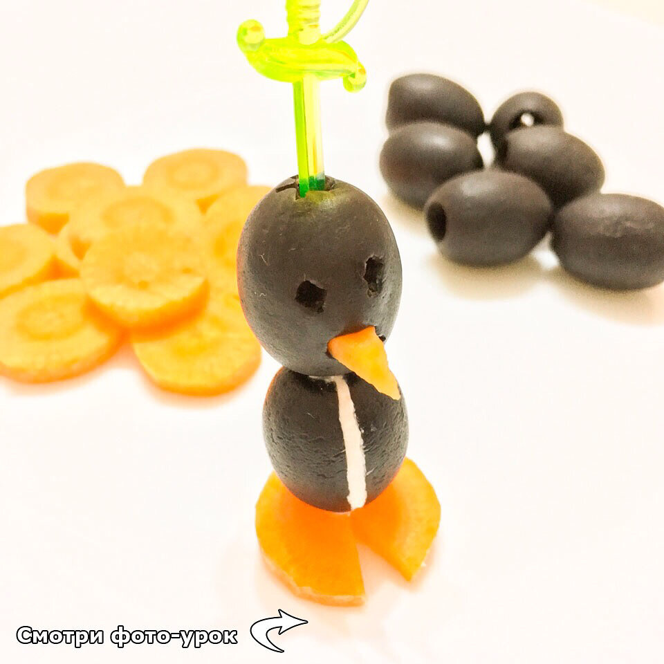 Всем здравствуйте. На связи Оксана и сегодня будем делать забавного пингвина из оливок. Начнем.