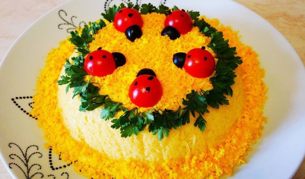 5) Украшаем салат. Смажьте верхушку майонезом, посыпьте яичным желтком самый верх салата и внизу вокруг. С помощью помидорок черри и маслин изобразите милых божьих коровок, как на фото, а из зелени очертите полянку.