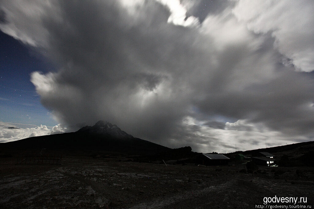 Короткий неспокойный отбой после восхождения на Кибо, подъём в 11 вечера, старт в полночь. Задача — к рассвету взойти на высочайшую точку Африки, пик Ухуру, 5895 м. Это значит за 6 часов подняться на 1200м.«Я шепнул себе только «ура», я промолвил всего лишь «вперёд»… » Снаружи тучи закрывают луну, идёт снег. Около полуночи, делаю первый свой шаг, закрываю за спиной дверь и ухожу в темноту и холод.