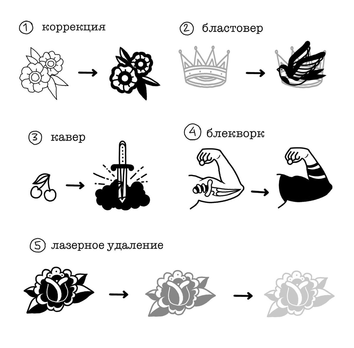 Разрешите представить вам краткий гайд по способам изменить/убрать тату в картинках, который я нарисовала сама и которым очень горжусь. Можно бегло ознакомиться и дальше мы разберём каждый способ подробнее.
