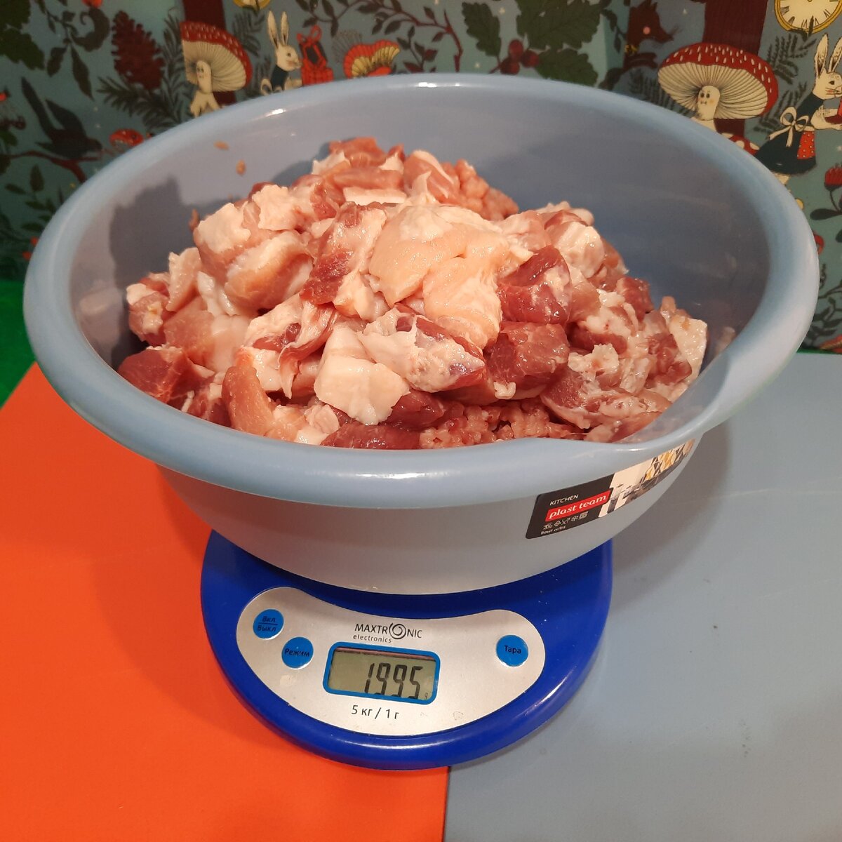 Нарезал грудинку, окорок прокрутил в мясорубке. По итогу получил 1995 грамм сырья.