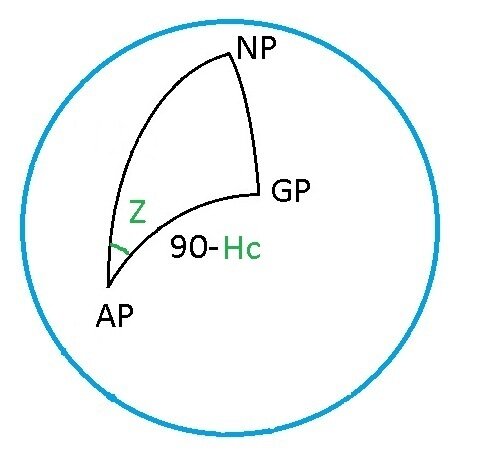 И конечно, вычисление координат тоже основано на геометрии параллактического треугольника. В ходе такого вычисления необходимо находить значения азимута Z и высоты светила Hc: