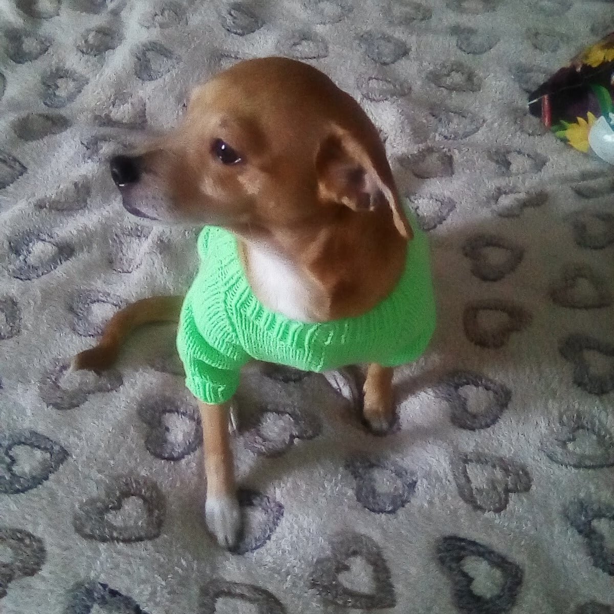Это моя Боничка, ей уже 7 лет, но она та ещё модница, обожает наряды. Но а так как мы живём в Сибири, у нас холодно, и зимой Боня очень мёрзнет, поэтому вяжу не только детям и внукам, но и конечно же Богине.