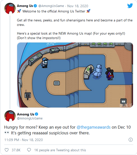 Запись стала первой в истории профиля. Твиттер Among Us был создан в октябре 2020 года, однако до этого постов в нем не было. В комментариях к скриншоту авторы игры оставли сообщение, что больше подробностей о карте станет известно во время награждения номинантов премии