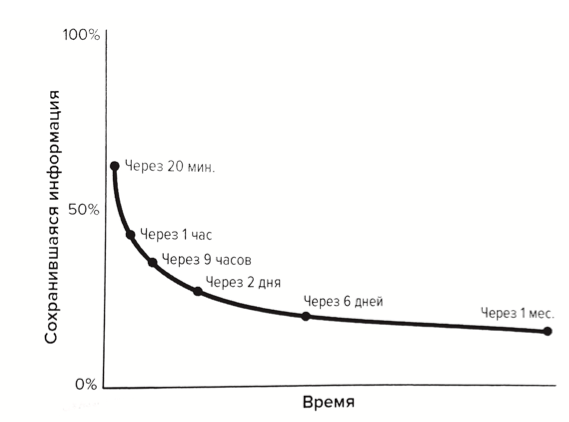 Я вас обманул, так как все таки не удержусь, чтобы не привести здесь так называемую кривую Эббингауза. Герман Эббингауз еще в 19 веке составил кривую забывания, то есть, что остается в нашей памяти спустя определенное время.