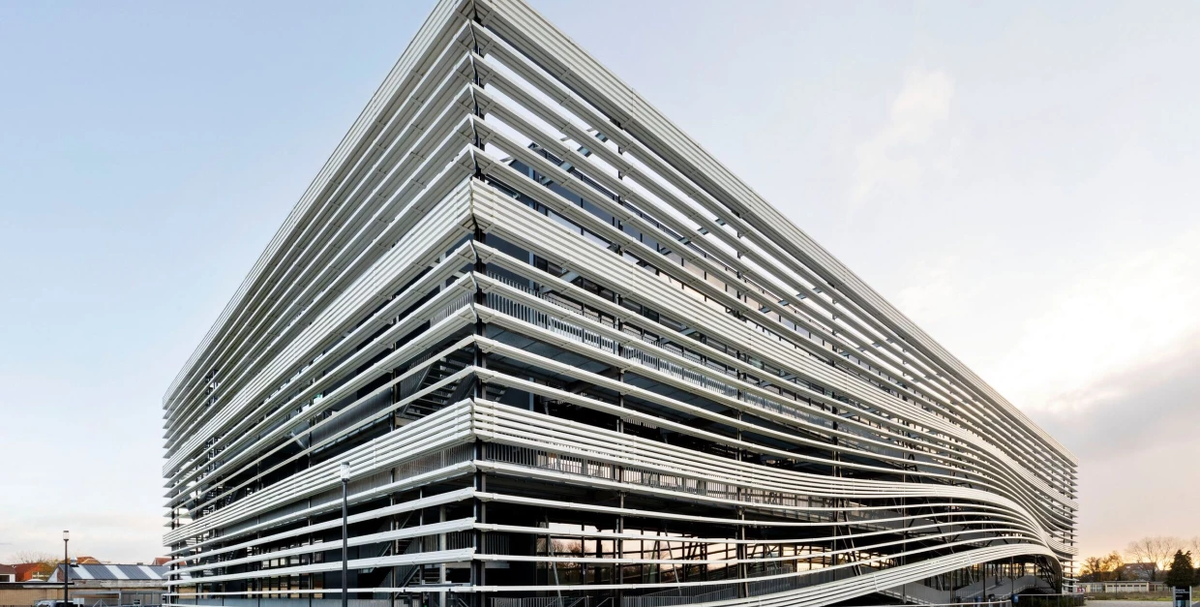 Пултрудированные стеклопластиковые армированные полиэфирные профили составляют планки неподвижных ламелей вокруг объема с фасадами из стекла и алюминия. Профили длиной 36 м были доставлены на участок прямо. На площадке несколько профилей были изогнуты упруго, чтобы создать привлекательную точку главного входа в здание.