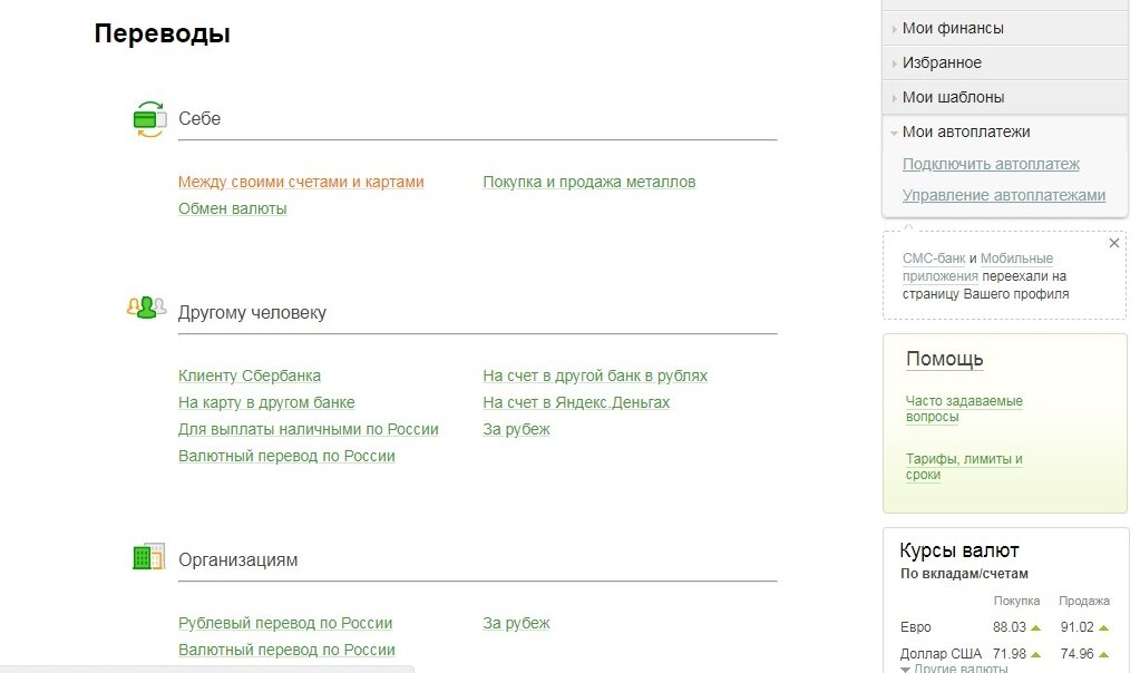 В разделе Переводы СЕБЕ по логике должна быть возможность перевести СЕБЕ на карту в любом банке, но У Сбербанка СЕБЕ это значит только внутри СБЕРА на свои счета.