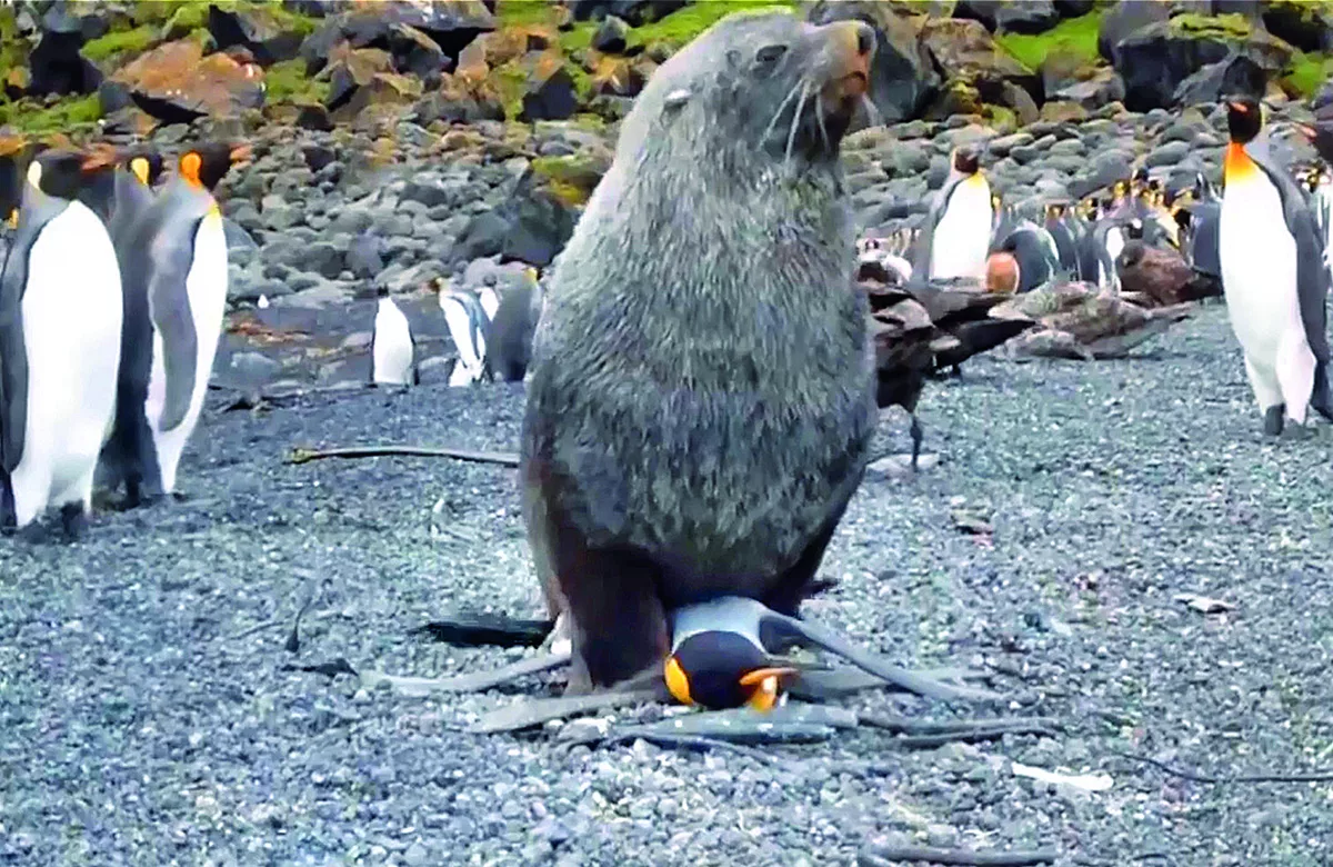 Для тех кто не знает, оказывается дикие Тюлени начали "нападать" на королевских пингвин. Сначала ученые заметили это ещё в 2006 году. Но тогда подумали что это был какой то неопытный тюлень который не знал что