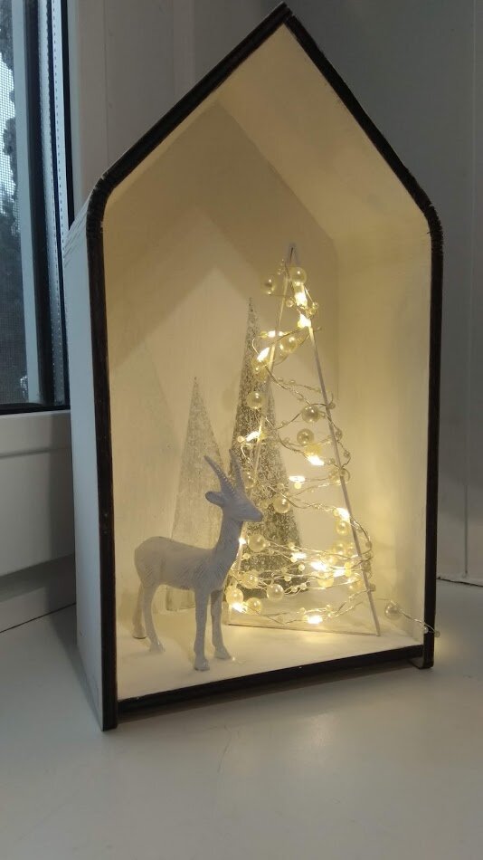 Коробку покрасила белой краской, на заднике нарисовала елки.
