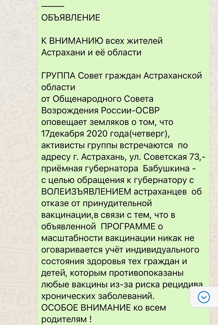 «К ВНИМАНИЮ всех жителей Астрахани и её области. ГРУППА Совет граждан Астраханской области от Общенародного Совета Возрождения России-ОСВР оповещает земляков о том, что 17декабря 2020 года (четверг), активисты группы встречаются по адресу г. Астрахань, ул. Советская 73,-приёмная губернатора Бабушкина...».