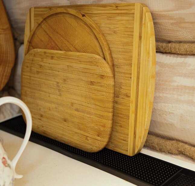 Можно большой, чтобы положить рядом с мойкой и сушить на нем посуду, но я больше топлю за узкий-длинный для деревянных досок. Потому что он для них идеальный: на нем ничего не скользит, вода легко отводится, деревяшки на нем не гниют, моется на раз, места не просит. В интернете их полно по запросу «барный коврик».