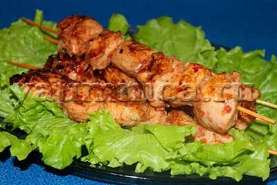 5. Готовый куриный шашлык достаем из духовки. На блюдо выкладываем салатные листья, а на них шашлыки. Подаем к столу. К ним можно подать соус или салат. Всем желаю приятного аппетита!
