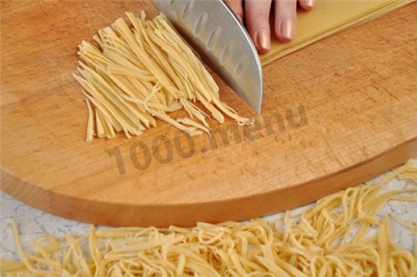 - 2. Раскатать тесто в тонкие листы и дать им немного подсохнуть. Каждый лист теста нарезать полосками шириной 5 см, а эти полоски нарезать тонкой соломкой.