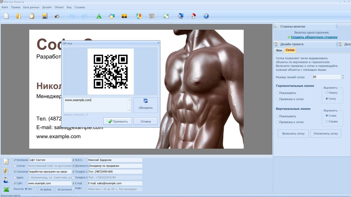 - Удобное выравнивание элементов визитки, возможность привязки к сетке.